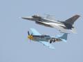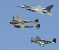 The 2010 Chino airshow was a must-see for aircraft enthusiasts who like to see warbirds in tight formation, like this P-38 Lightning, P-51 Mustang and Supermarine Spitfire. There were plenty of other formations, such as an A-1 Skyraider and T-28 Fennec, an F-86 Sabre with a MiG-15 "Fagot", and an Air Force "Heritage Flight" with two P-38s, a P-51 and an F-16 Fighting Falcon. We were also treated to formations by single types, like two F6F Hellcats, two F4U Corsairs, and three P-51s with both high-back and low-back models together. |