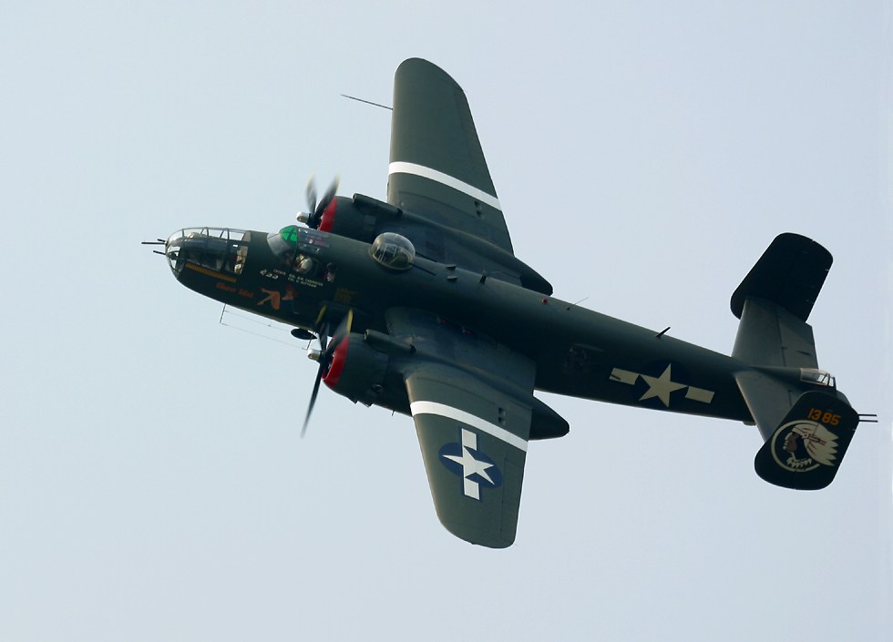 Every year the Thunder Over Michigan airshow brings together large numbers of warbirds, including large numbers of a single type. The peak year for the show must have been 2005, when they were able to bring together eight of America's nine airworthy B-17 Flying Fortresses. This year it was the turn of the B-25 Mitchell, with no fewer than fifteen of these bombers in the air at one time, the most since filming of the movie "Catch 22". |