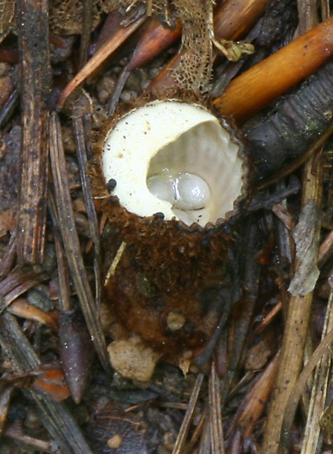Here's a closeup of the bird's nest fungus. The white "eggs" within the cup are actually packets of spores. Water splashes into the cup and throws the packets away from the parent, however it's hard to imagine them going very far, and it seems like normal wind-borne spore dispersal would be a better approach. |