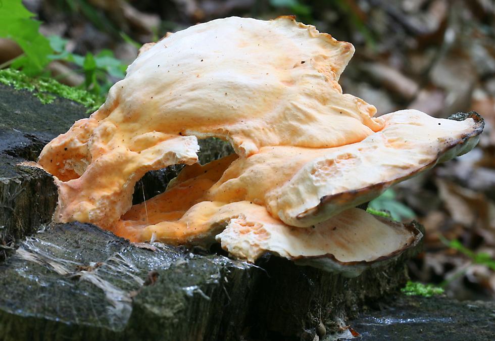 Back to Karlstejn, but staying with the theme of weird shapes, here's one that looks like it was extruded from the stump as a molten mass. It's similar in appearance to the chicken of the woods fungus that I photographed some years previously in Illinois. That fungus is said to taste much like its namesake, and indeed this Czech example has also had large chunks taken out of it. I don't know what made the bite-shaped marks on the left, but the surface indentations look like the work of slugs or snails, and there's certainly plenty of slime around. |