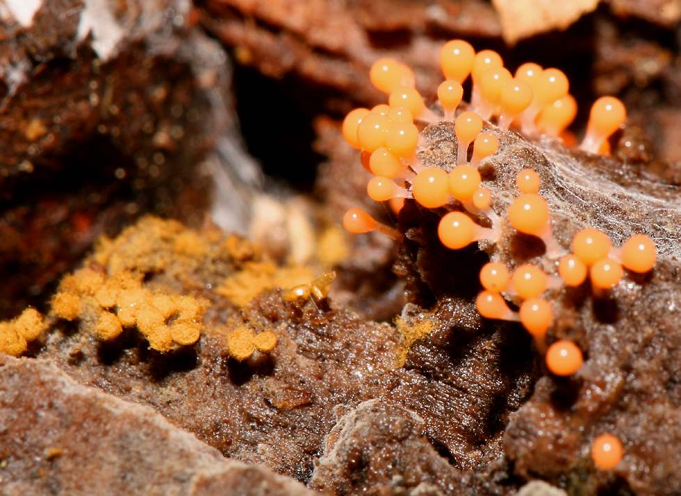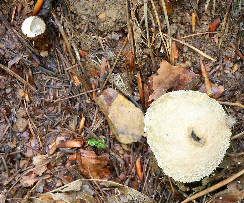 This puffball doesn't have an interesting shape like the earthstar, but it is paired up with a strange-looking fungus, a so-called bird's nest fungus. |