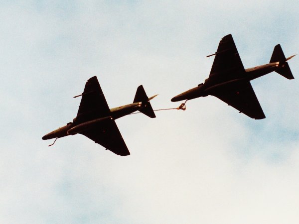 The only special piece of equipment required for airshow photography is a long lens. You don't need an auto-focus camera and you don't need image stabilization or vibration reduction, but if you can't fill the frame with the aircraft then your photos will lack impact. If you're using a 35mm camera system then I'd suggest a lens with focal length of 300mm as a good starting point. At the other end of the scale, there's only limited value in going over 500 or 600mm, because haze will wreck any photo you take from a great distance, and there often isn't enough light to allow you to use the fast shutter speeds required by such lenses. The speed of the lens can also be important, and you should certainly try to get a lens no slower than f5.6. If the sky is overcast then a fast lens with an aperture of f2.8 will get shots that will be missed by a slower amateur or "prosumer" lens, rated at f4 or f5.6. However, these fast lenses cost an enormous amount of money and they're large and heavy, which makes them difficult to handle for the 4 or 5 hours that an airshow can last. A tripod or monopod can help, but the presence of a crowd of people makes a tripod impractical, and even a monopod makes it very difficult to pan with a fast moving aircraft. A zoom lens will let you capture a variety of action, from small aircraft to groups of aircraft flying together, however it's much more difficult for a manufacturer to design a zoom lens which produces photos as sharp as a prime lens, so prime lenses tend to be sharper than zooms. |