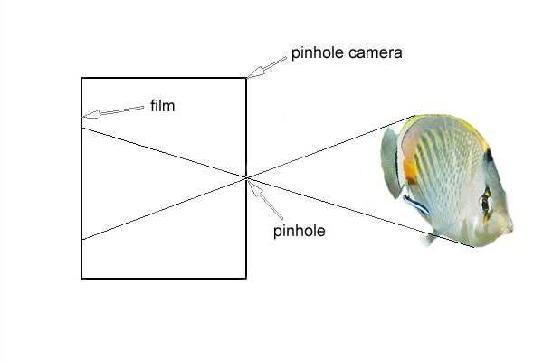 The simplest type of camera is called a "pinhole camera". It consists of a box with film on one side and a single small hole on the side opposite the film. There's no lens, and the "shutter" is often just a piece of cardboard or tape which is used to block the pin hole. Since the pin hole is often very small, not much light can enter the camera and an exposure often takes several seconds or even minutes to complete. Since it's so simple, it's a very useful tool for understanding how a regular camera works. As you can see, a beam of reflected light from the top of the fish would pass through the pin hole and hit the film near the bottom; in the same way, a beam of light from the bottom of the fish would pass through and hit the film near the top. The image of the fish created on the film would therefore be upside-down, and it would also be inverted left-to-right. This also happens with regular cameras, and even with the human eye - but the brain automatically uninverts the image for us! |