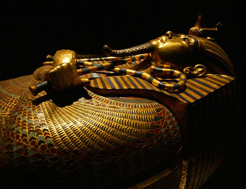 The death mask originally covered the head of Tutankhamun's mummy. Here you can see magic spells of protection inscribed on its shoulders, and similar spells appear on the back. The false beard is commonly associated with pharoahs, and even female rulers of Egypt such as Hapshetsut. |