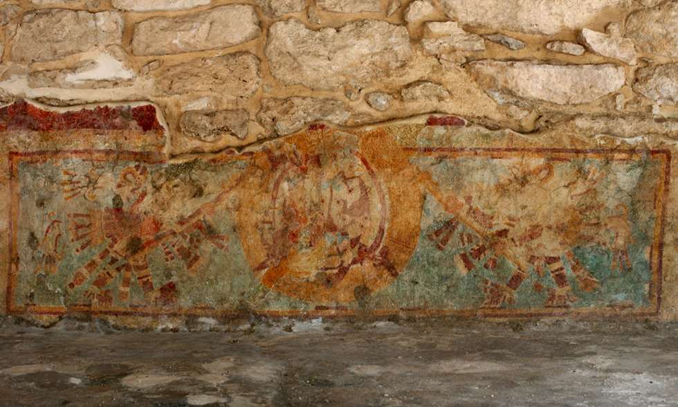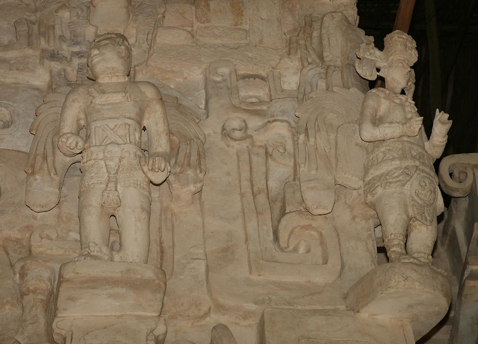 After the military defeat of Mayapan and its destruction by fire in 1441, the last remnants of central government in the Yucatan disintegrated and the individual Maya cities fell into a state of ongoing warfare with each other. When the Spanish arrived the people they met told them that they were men of Mayapan, and this is how the name "Maya" was applied to the entire civilization, both here in Mexico and throughout what are now the countries of Belize, Guatemala, El Salvador, Guatemala and the western part of Honduras. At the base of the temple of Kukulcan at Mayapan is an area with interesting stucco work and murals. Here you see a mural depicting two men with wooden poles holding up a circular banner, possibly a reference to the city's name, which means "Banner of the Maya". |