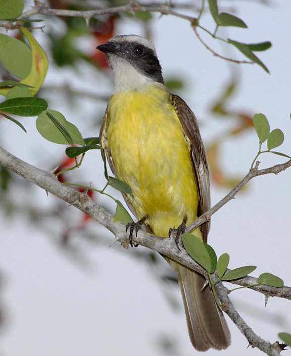 The Great Kiskadee is even more common than the blue-crowned motmot, though not as spectacular. It has an even wider range, all the way from Texas down to Argentina and Uruguay and, unlike the motmot, it can be found in cities. Although they belong to a group of birds called flycatchers, they'll eat almost anything, from insects to rodents, lizards and fruit. They're also very feisty, they'll mob hawks and other raptors to drive them away. The Great Kiskadee's call is said to be similar to the Spanish words "bien te veo", which in English means "I see you well". |