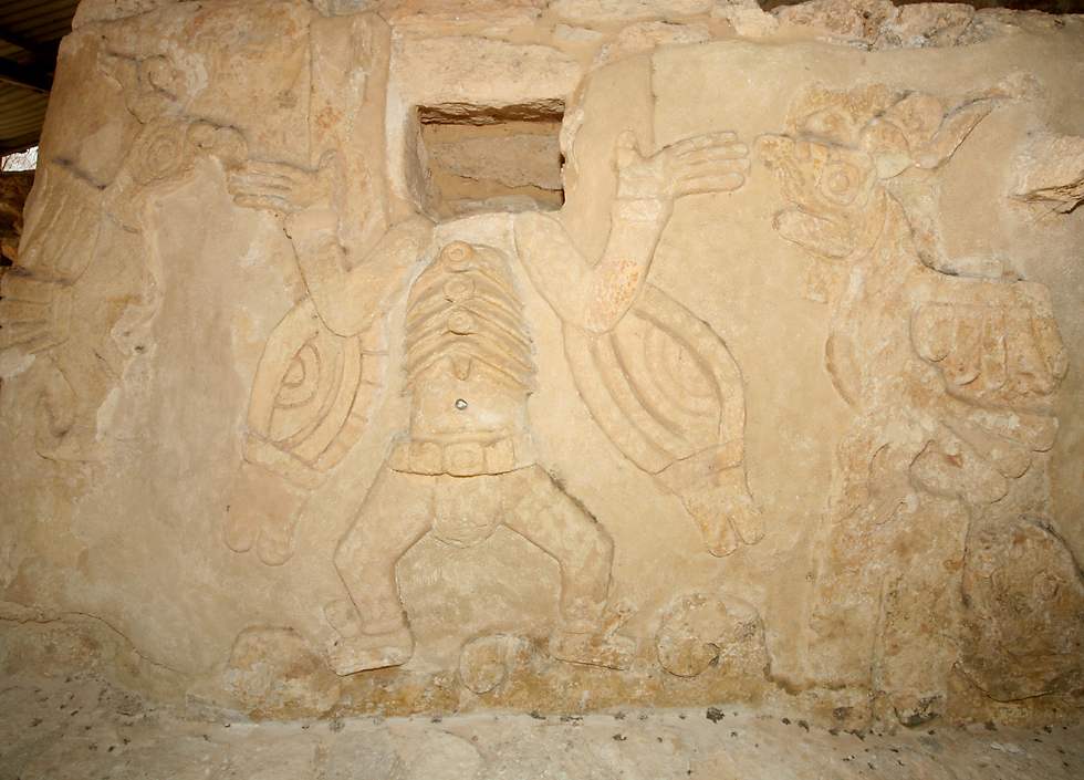 Mayapan is a Maya city founded quite late in the history of the civilization, around 1007 AD, when many cities elsewhere were already collapsing and being abandoned. During its 250 year period of power it exerted control over a large area including major cities like Uxmal and Chichen Itza. There are many architectural similarities between Mayapan and Chichen Itza, but the quality of the buildings at Mayapan is far lower than the earlier buildings at Chichen Itza, a sign of the Maya civilization's impending collapse. At Mayapan there are over 4000 stone structures scattered around a four square kilometer area bordered by a nine kilometer long stone wall, but the most interesting buildings are in the small ceremonial center area. In this area at the base of the main temple, a winged figure stands between two parrots. A niche above the figure would have held a head, either made out of precious materials or a real skull perhaps covered in stucco. |