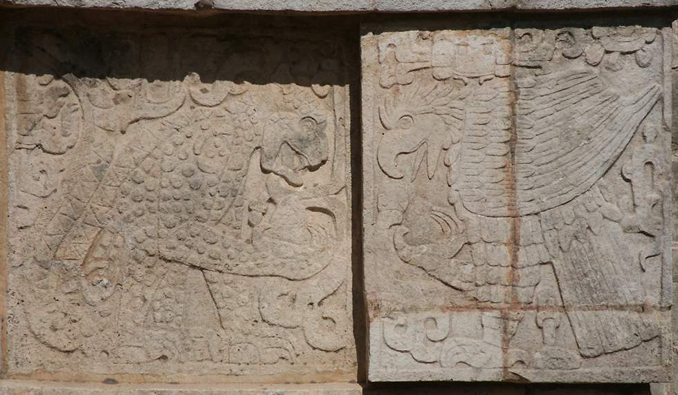 A jaguar and an eagle carved into the appropriately named Platform of the Jaguars and Eagles, near the Tzompantli at Chichen Itza. This carving is just as gruesome as those on the Tzompantli, since the jaguar and the eagle are both holding a human heart, which presumably has just been taken out of a human sacrifice. It's thought that the bird which is depicted is a harpy eagle, the largest and most powerful raptor in the Americas, quite capable of taking a monkey or sloth from a tree and carrying it away. |