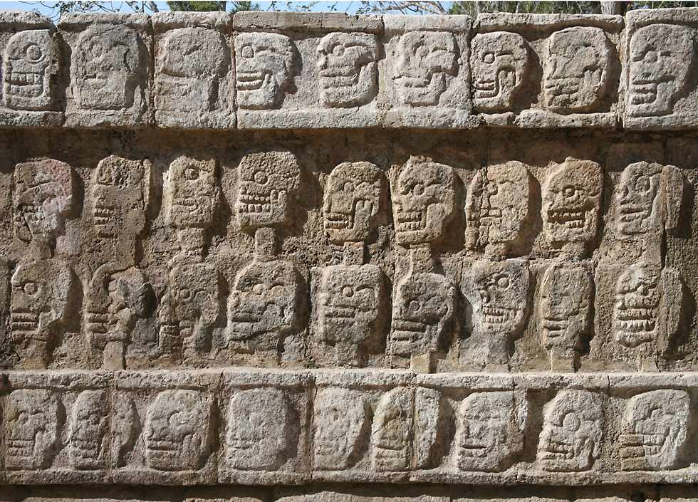 The Tzompantli is a low stone platform near the Great Ball Court at Chichen Itza, whose purpose was to serve as a place to display the skulls of sacrifical victims, perhaps those of the ball players themselves. Carvings of skulls surround the walls around the platform, with stairs leading to the top. The name tzompantli refers to large wooden racks used by different civilizations throughout Central America, with horizontal or vertical poles onto which skulls would be impaled. As you can see from this carving, at Chichen Itza the poles were vertical. At the Aztec Templo Mayor in the middle of Mexico City, there's an even more impressive Wall of Skulls which have been covered in stucco. At this same place a tzompantli was constructed to hold the skulls of Spaniards killed during the initial attempt to conquer the Aztecs, as well as the skulls of their horses, which were a huge novelty in an area where there had previously been no beasts of burden. One Aztec tzompantli was thought to hold up to 60000 skulls, though most were far smaller. |