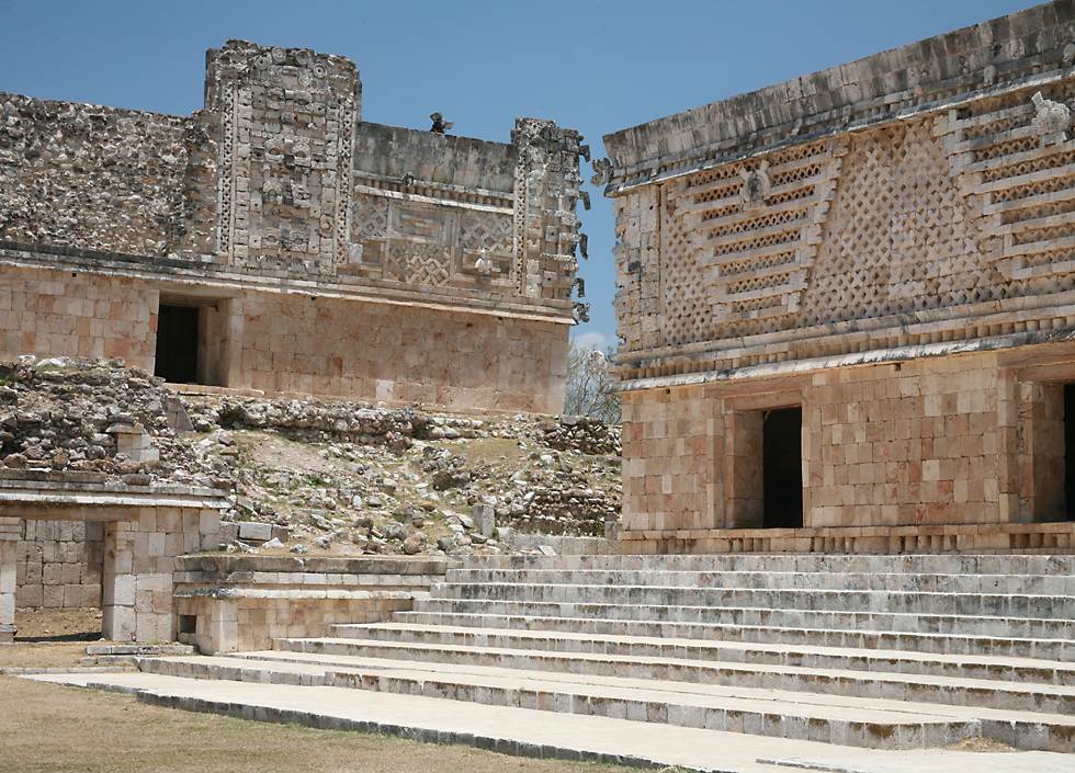 Two of the large buildings in the Nunnery Quadrangle at Uxmal. The four buildings in this large square are built at different levels, which might have a cosmological significance, along with their alignment. Whether that's correct or not, it's certainly true that all four buildings are intricately decorated, with geometric patterns, snakes, masks of the rain god Chac, and many other different figures. |