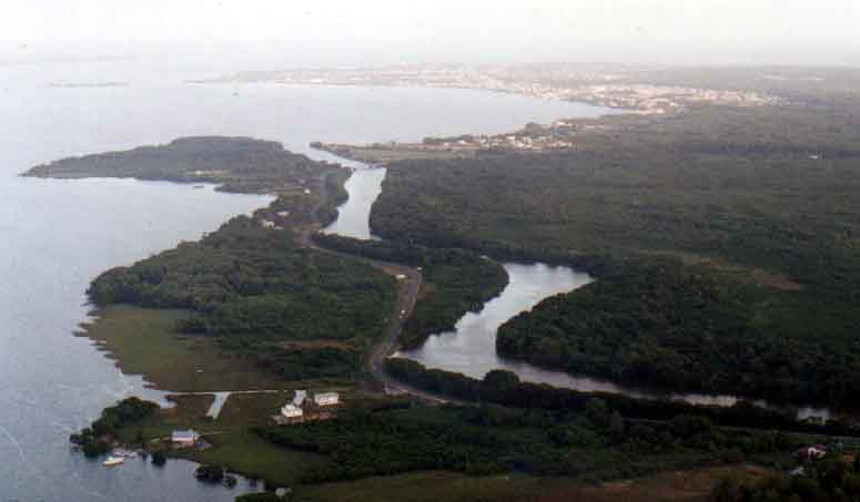 The country of Belize occupies the South Eastern corner of the Yucatan Peninsula, directly South of Mexico, with Guatemala on its Western border, and Honduras on the Southern border. To the East is the Carribean sea, which is the big magnet drawing tourists to the country. The photograph below shows Belize City, the largest city, a fairly sleepy and somewhat seedy place which used to be the capital city before the government moved inland to avoid hurricanes. |