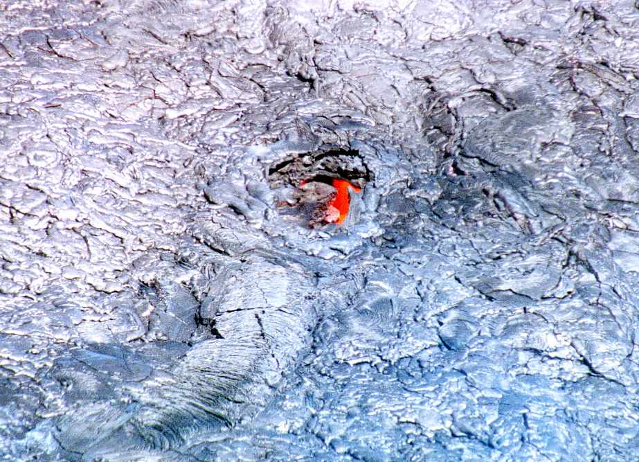 The lava coming out of Kilauea mostly doesn't flow on the surface of the lava field. Instead, it flows underneath in very long lava tubes, appearing on the surface only as it nears the ocean. However, the lava is fragile, and sometimes the roof of the lava tube collapses, resulting in a "skylight". |